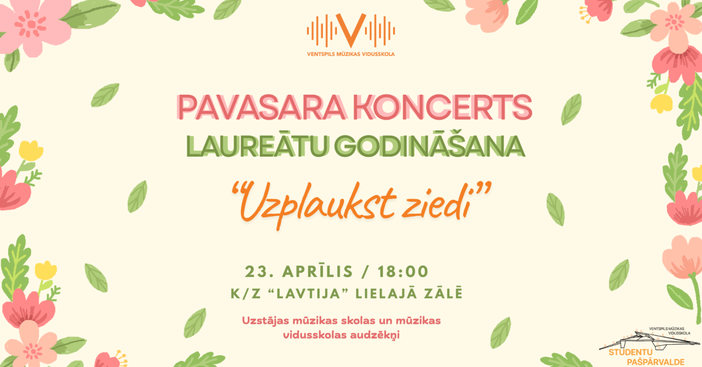 Aicinām ikvienu uz Ventspils Mūzikas vidusskolas Pavasara koncertu un laureātu godināšanas pasākumu “Uzplaukst ziedi”, kas notiks 23. aprīlī plkst. 18.00 koncertzāles “Latvija” Lielajā zālē.